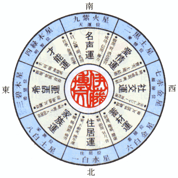 印面の八方位は天地自然の法則を意味し、人間の精神、肉体など全てを易理と照合して印面に表したものです。この印面に上の図の家族運、希望運、才能運、名声運、愛情運、社交運、蓄財運、住居運という八つのポイントを調和良く配分したものが吉相印です。